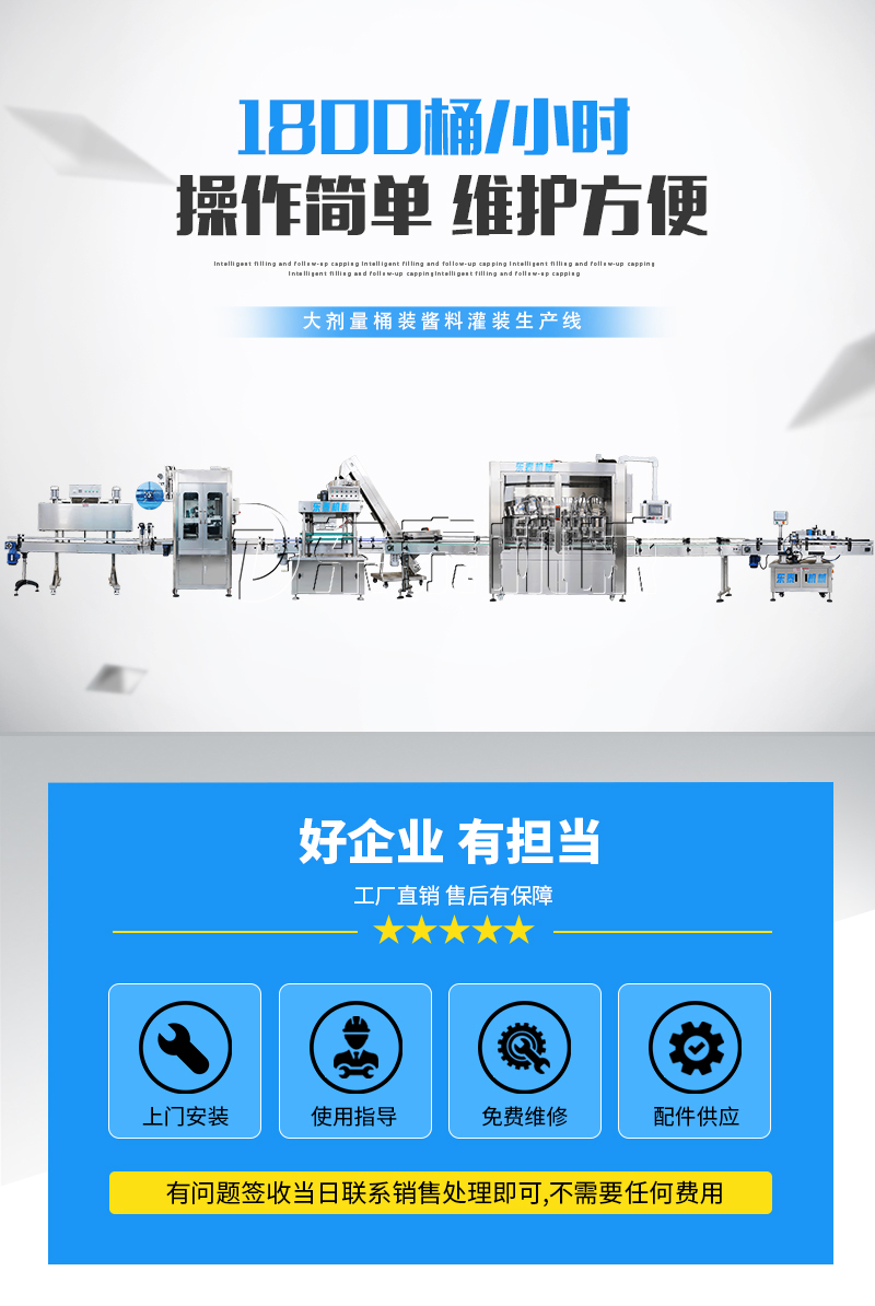 該醬油醋灌裝機采用活塞式伺服系統驅動原理,適用于粘流體中帶小顆粒并且可流動的較為粘稠的物料灌裝。比如:洗衣液、洗潔精、甜面醬、沙拉醬、芝麻醬、食用油等的灌裝。設備采用伺服系統定量推料,在人機界面數字化調節計量,并且可設定所需計量,觸摸屏一觸即達,而且可以單頭微調計量。操作簡單,維護方便,節省人工成本,生產效率更高。